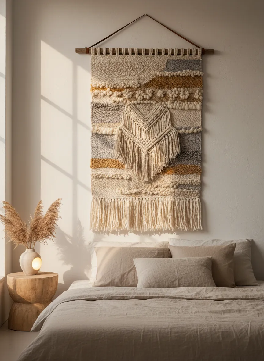 Fabric hangings add texture to smooth walls. Soft fibers create a warm and inviting look. Neutral shades keep the mood gentle. The decor feels calm and comforting.