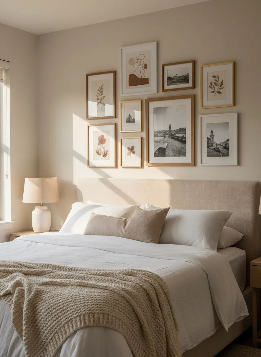 The bedroom gains subtle interest without clutter. Gallery layouts suit spaces above dressers or benches. This cozy wall styling option feels personal yet simple.
