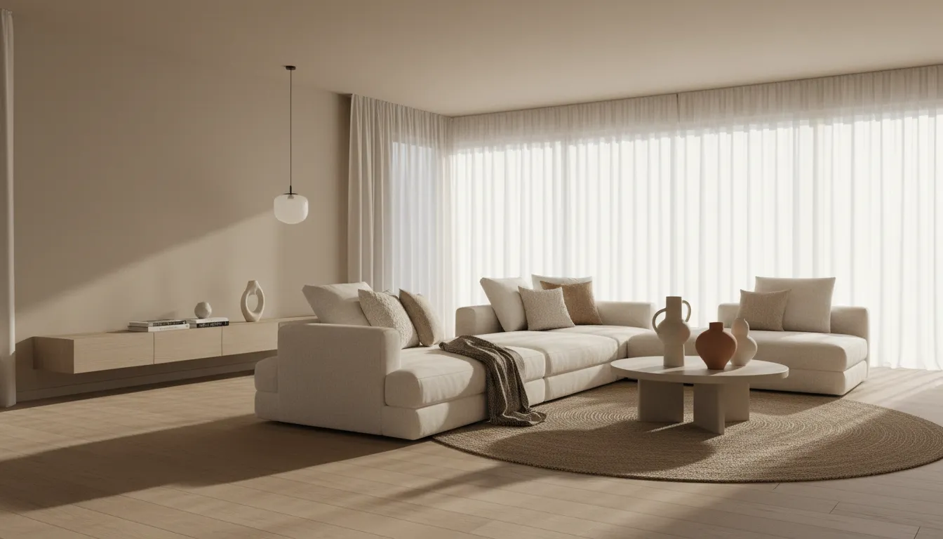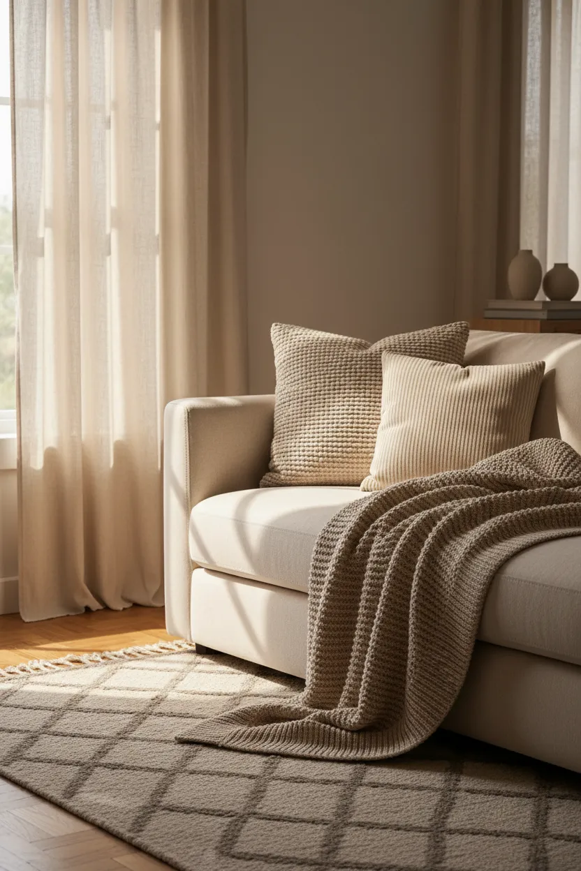 Cozy texture layers bring life to beige rooms without adding strong color. Linen curtains soften window edges and filter light gently. A woven rug grounds the seating area with quiet pattern. Cushions vary in fabric, not shade. Soft throws add comfort through touch and weight.