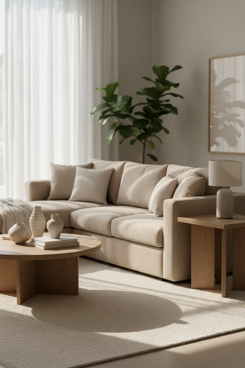 Light wood accents add warmth while keeping the room bright. Oak or ash tables bring gentle contrast against beige textiles. Rounded edges feel softer than sharp corners and heavy lines. Wood grain adds natural detail without strong pattern. The look stays calm, even with multiple pieces.
