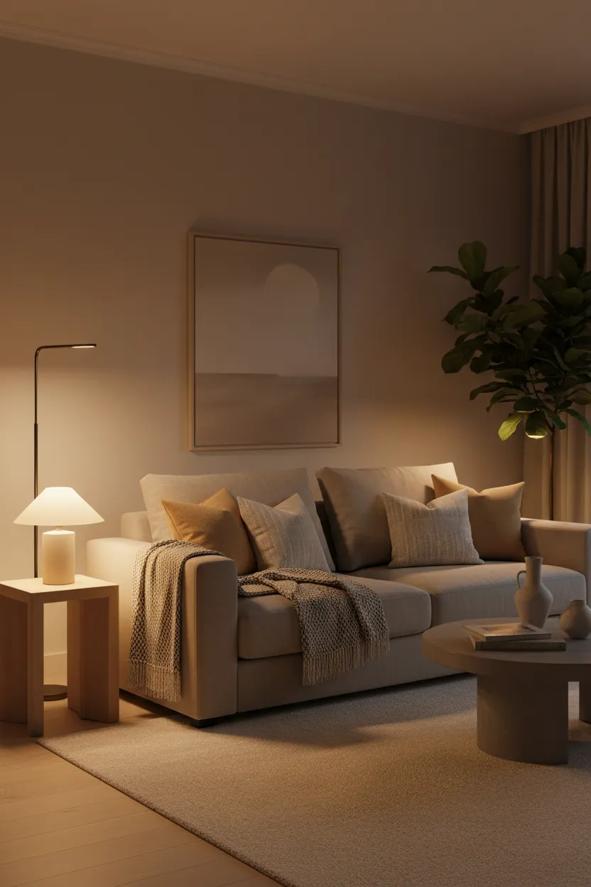 Soft ambient lighting keeps beige rooms warm after sunset. Lamps create gentle pools of light that flatter neutral walls. Warm bulbs reduce harsh contrast and strong shadows. Light reflects softly off matte surfaces and fabric. The room stays calm, even with lower brightness.