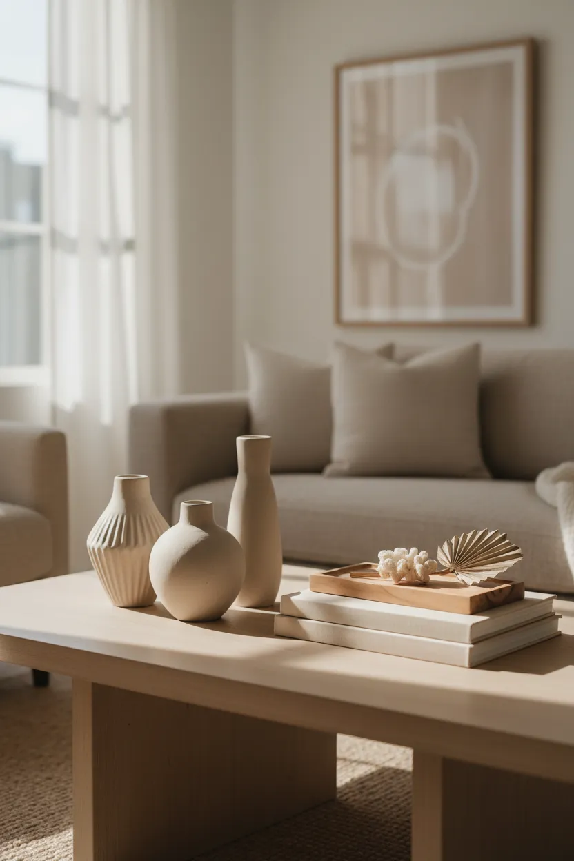 Warm neutral accessories work best when shapes stay simple and soft. Ceramics in cream and sand tones add gentle structure. Books and trays keep lines clean and organized. Spacing matters more than quantity. Each item sits with breathing room around it.