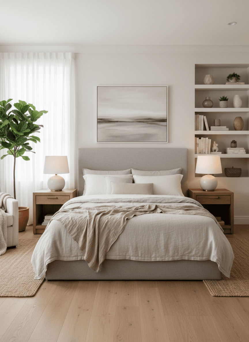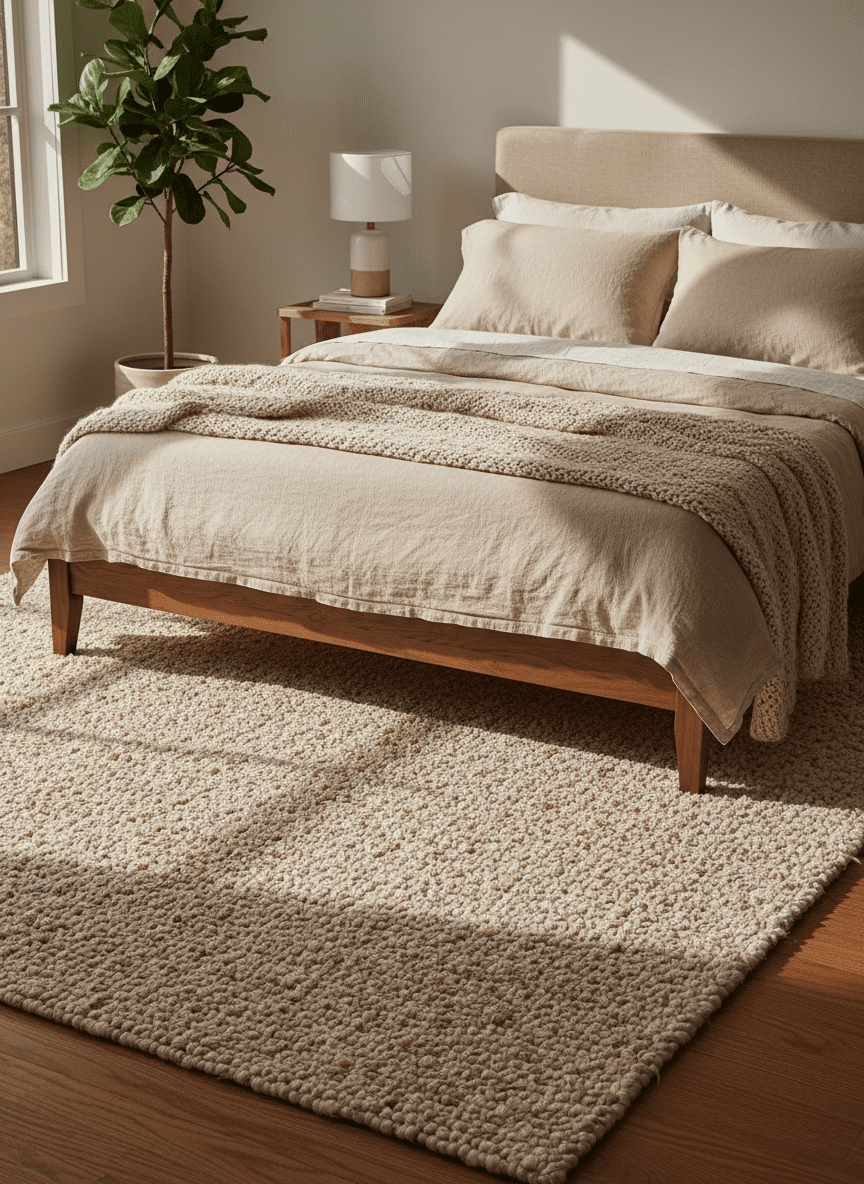 Area rugs add warmth beneath the bed. Wool textures feel soft and quiet. Colors remain within the neutral palette.