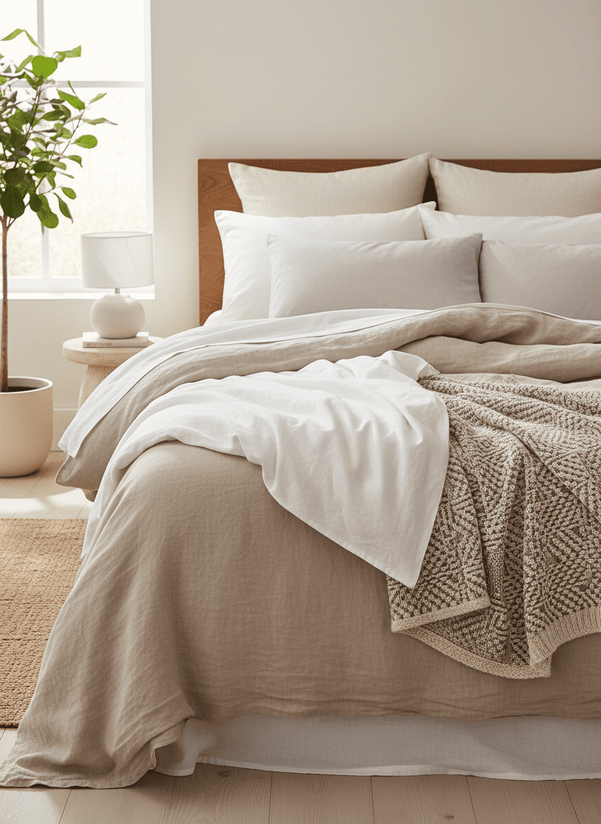 Layered bedding adds softness through texture. Linen sheets feel breathable. Cotton duvets create gentle volume. Throws introduce warmth without weight.