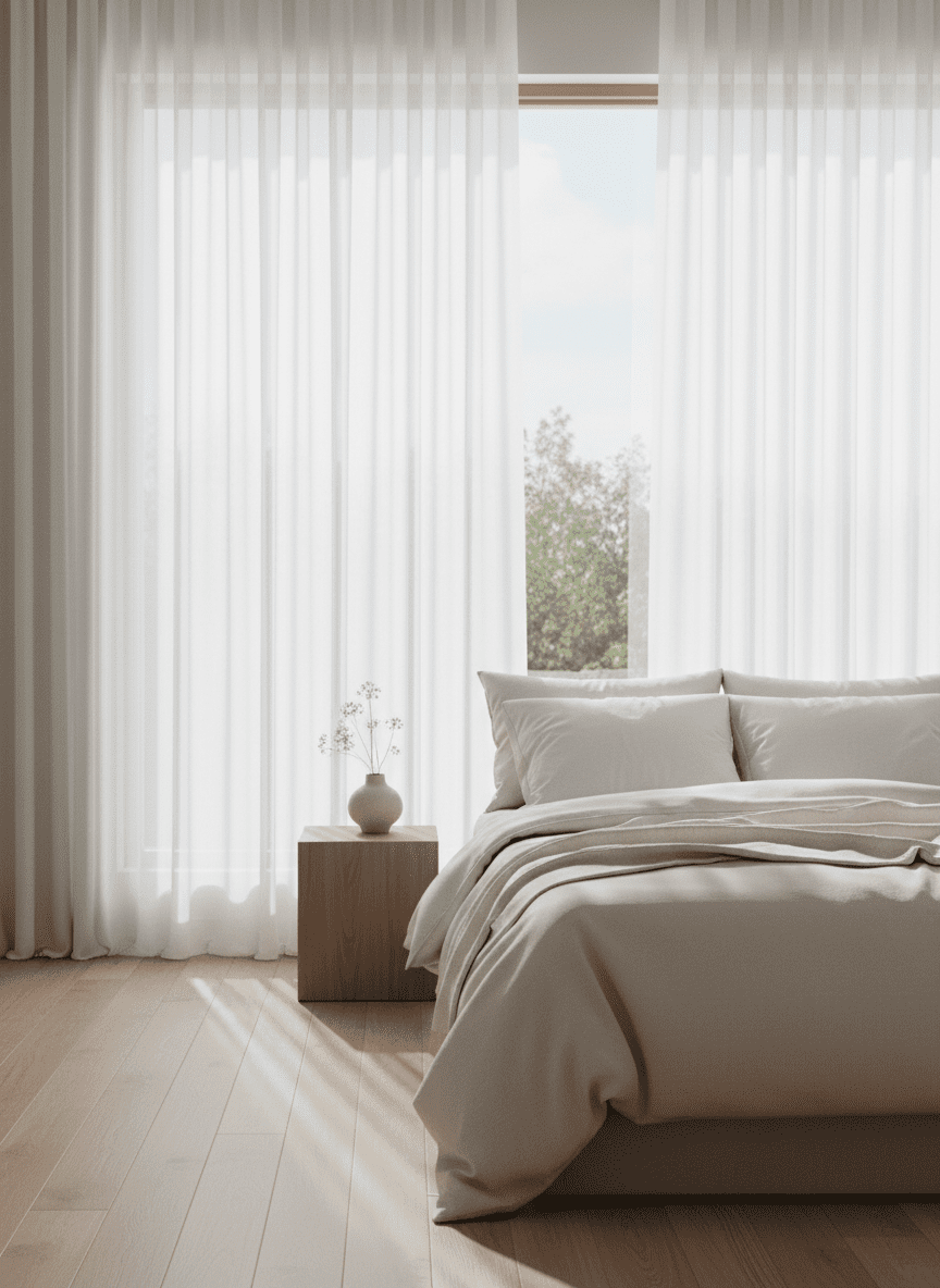 Sheer curtains filter daylight gently. Fabric movement adds softness. Brightness spreads evenly across the room.
