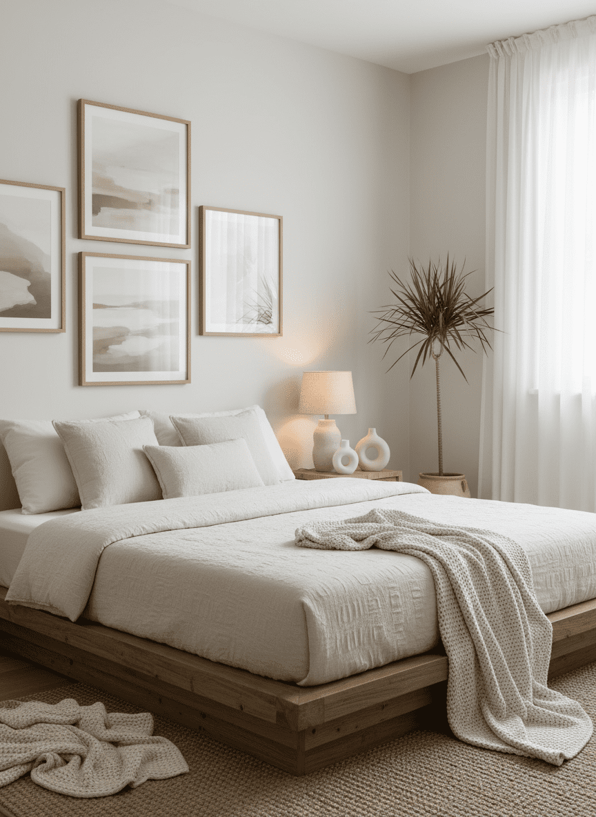Decor accents add character quietly. Rounded ceramics and soft artwork feel gentle. Colors stay muted.