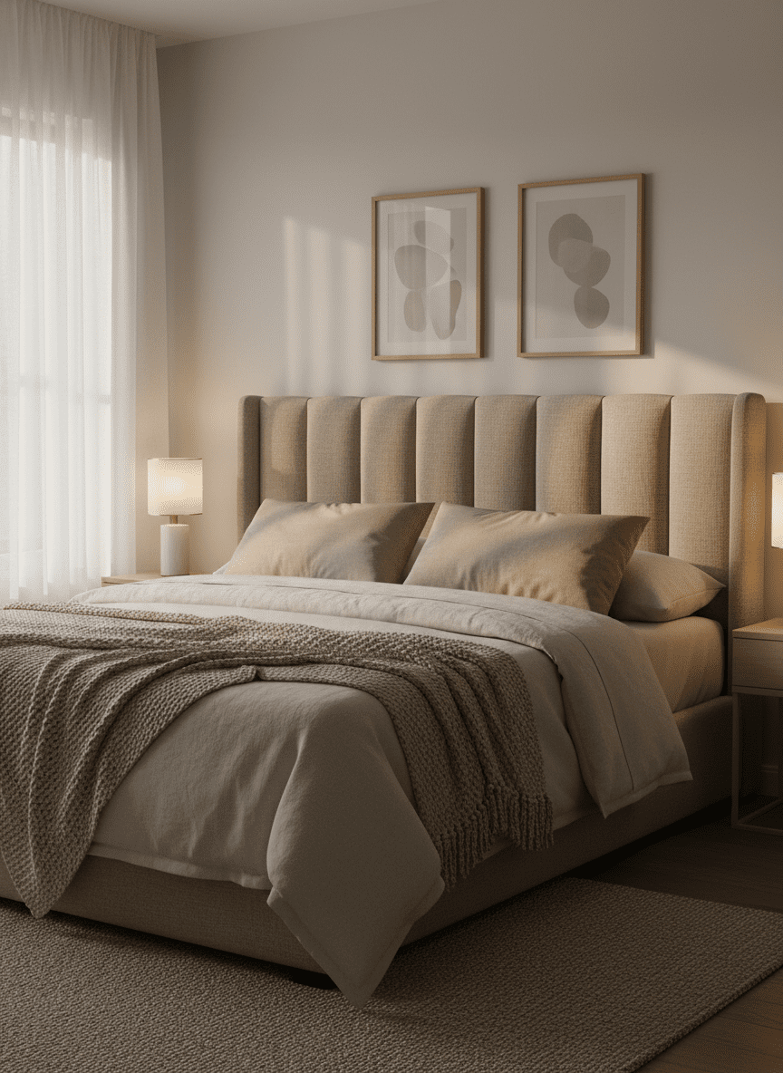Fabric headboards soften the structure of the bed. Upholstery adds warmth behind pillows. Neutral tones blend easily with walls. Edges appear gentle rather than sharp.