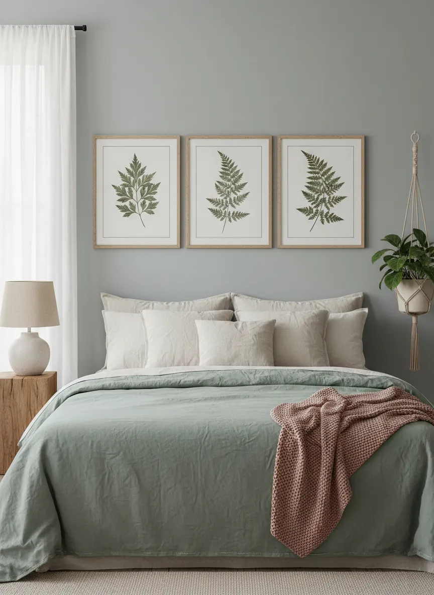 Botanical prints introduce nature softly. Leaves and organic shapes feel calming. Colors remain muted.
