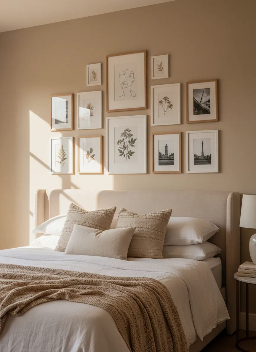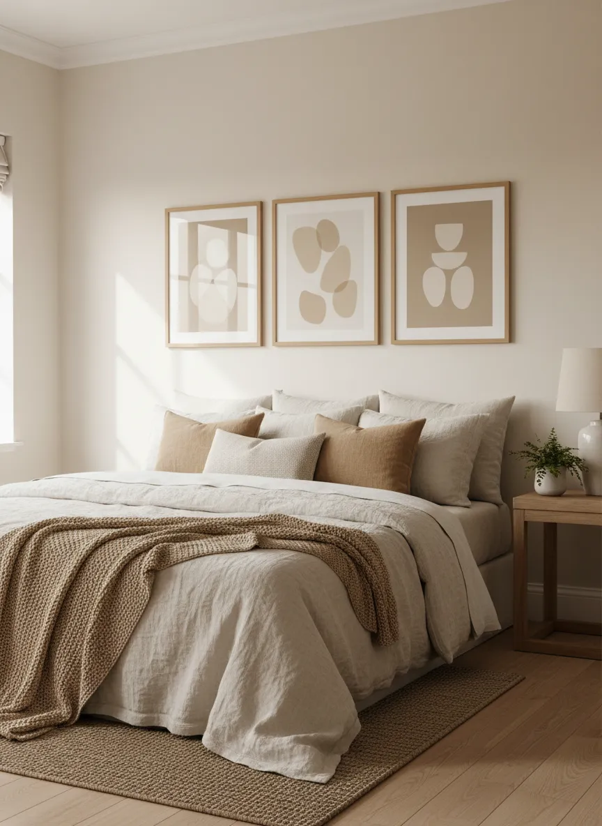 Neutral artwork adds structure without visual noise. Soft landscapes and abstract prints feel calm. Colors stay within beige and warm gray tones. Frames remain light and simple.
