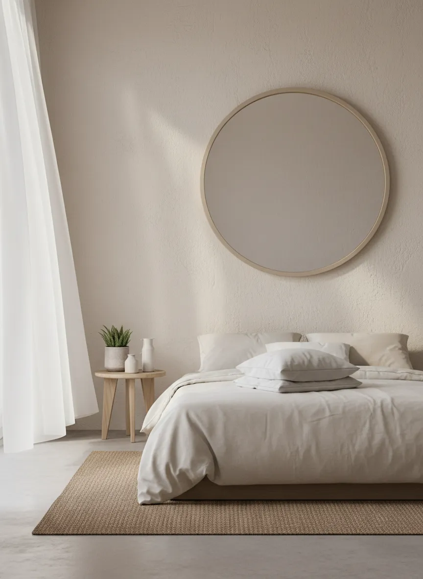 Mirrors reflect light and openness. Rounded shapes soften straight lines. Frames stay thin and warm-toned.