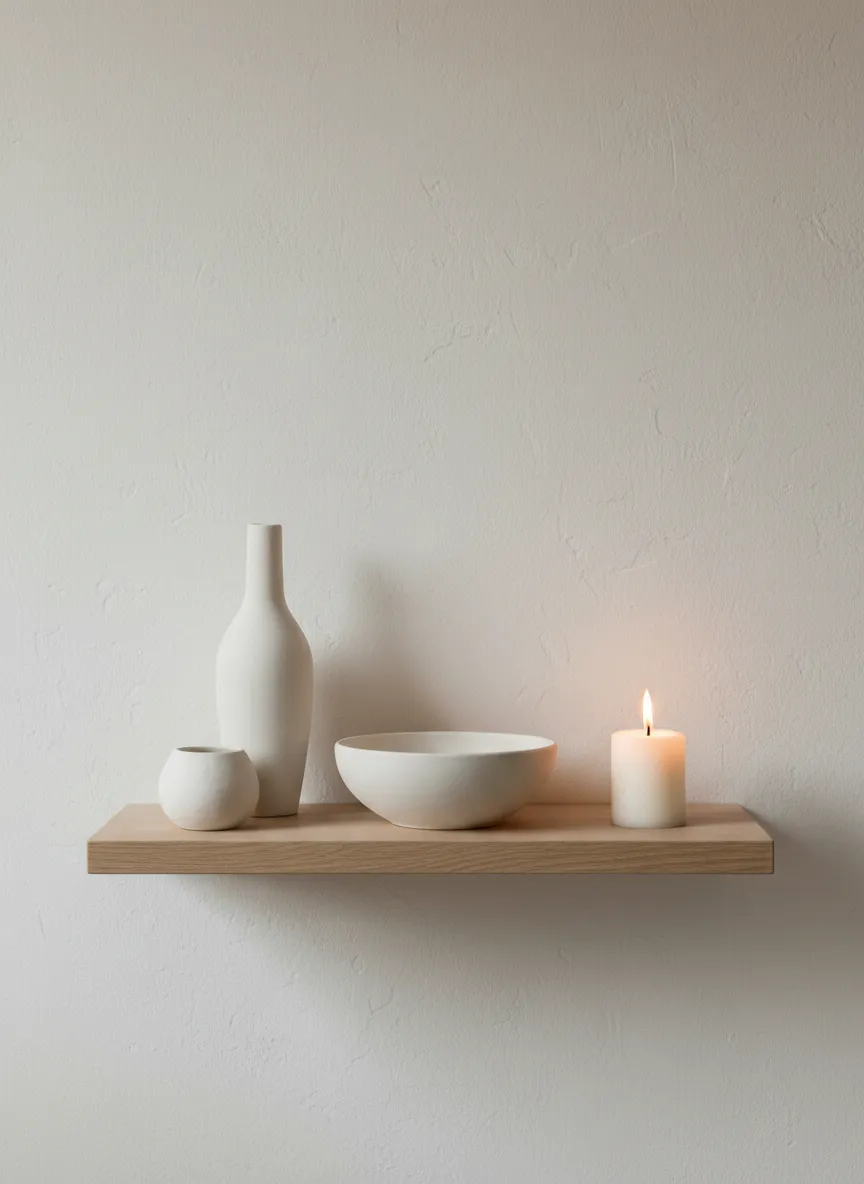 Small decor pieces add personality without clutter. Candles, books, and ceramics create gentle interest. Neutral tones keep the look calm. The layout stays simple.