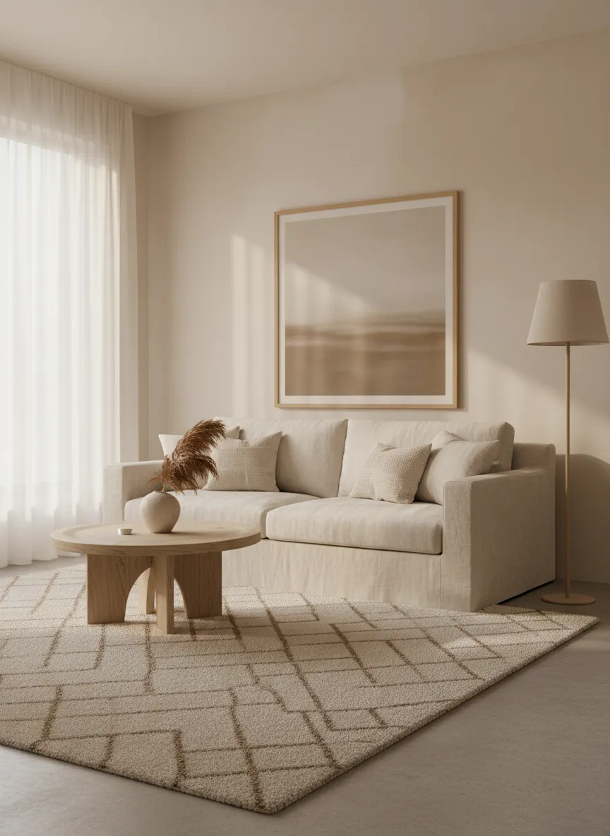 Rugs define spaces and add comfort underfoot. Soft textures warm the room visually. Neutral patterns keep the look subtle. The layout feels grounded.