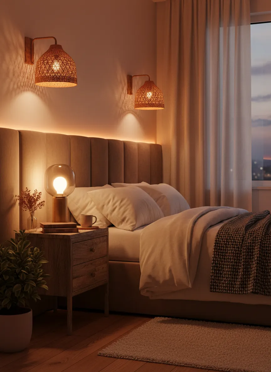 Layered bedside lights create a restful mood. Small lamps and soft bulbs reduce brightness. The atmosphere feels calm. Lighting remains functional.