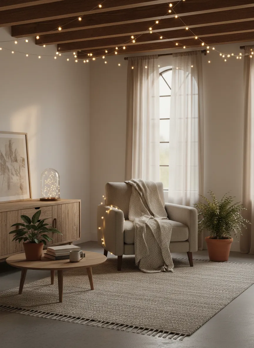 String lights add subtle sparkle without brightness. Warm tones create a relaxed mood. Simple placement keeps the design minimal. The room feels cozy.