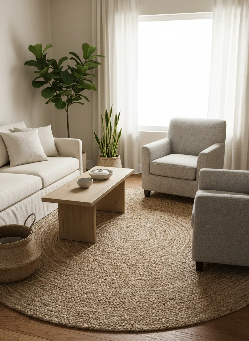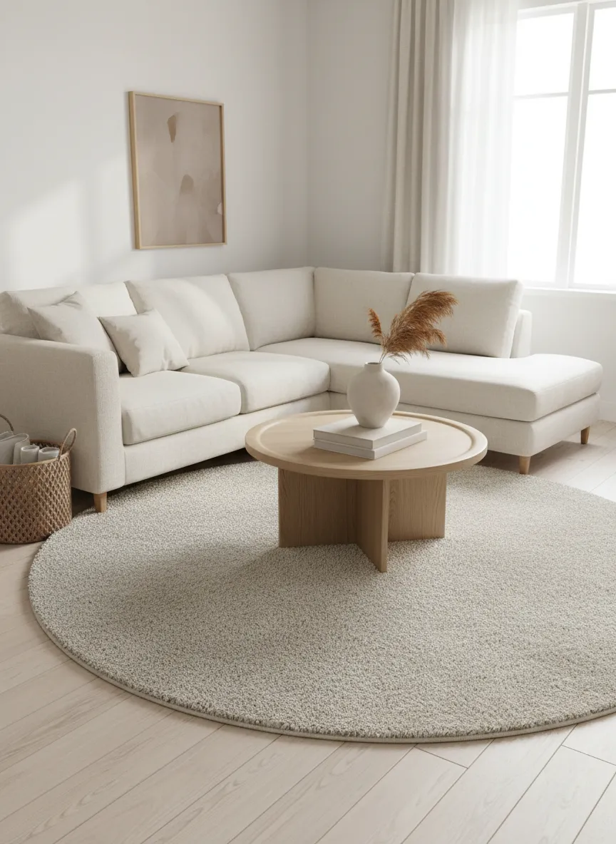 Round rugs soften the straight lines of furniture. Curved edges feel gentle and welcoming. Small spaces benefit from the rounded shape. Neutral tones keep the look balanced.
