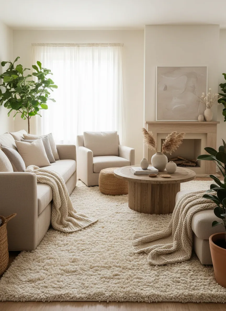 A large area rug anchors the whole seating layout. The rug extends beneath sofas and chairs to create visual connection. Soft beige or cream tones keep the look gentle. The texture feels warm and comfortable underfoot.