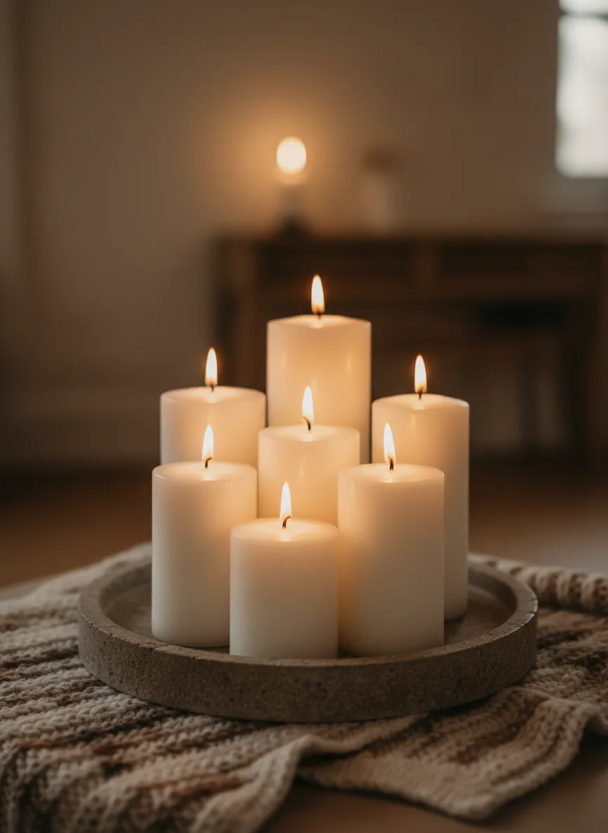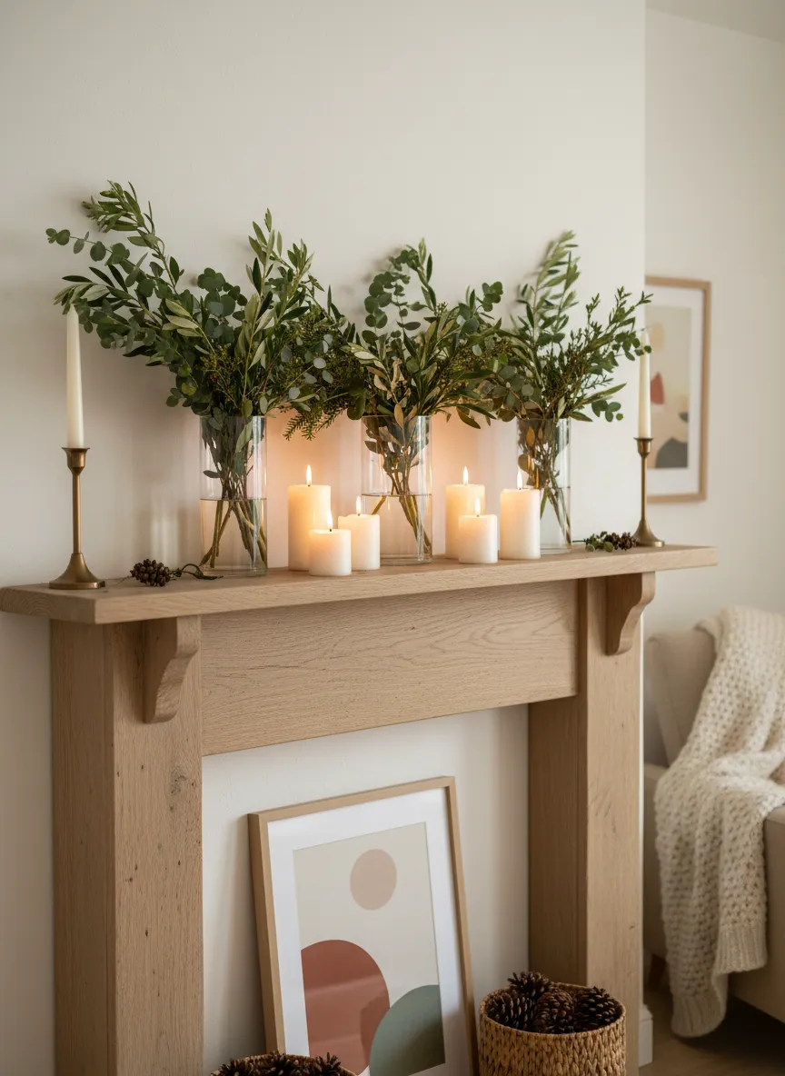 Candles add soft flickering light to winter spaces. Gentle glow creates a relaxing mood. Minimal placement keeps the look simple. The environment feels peaceful.