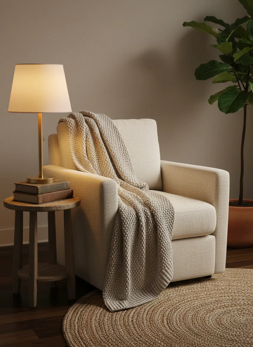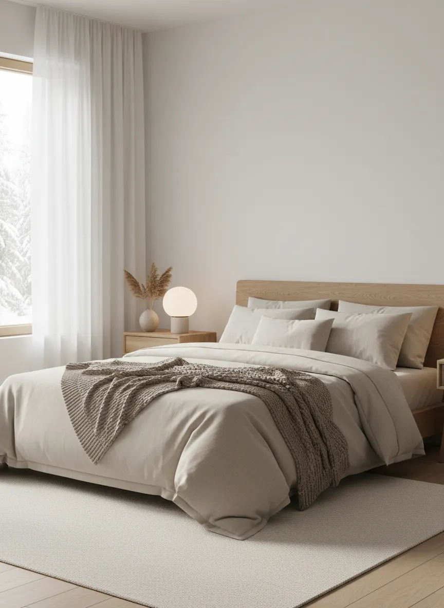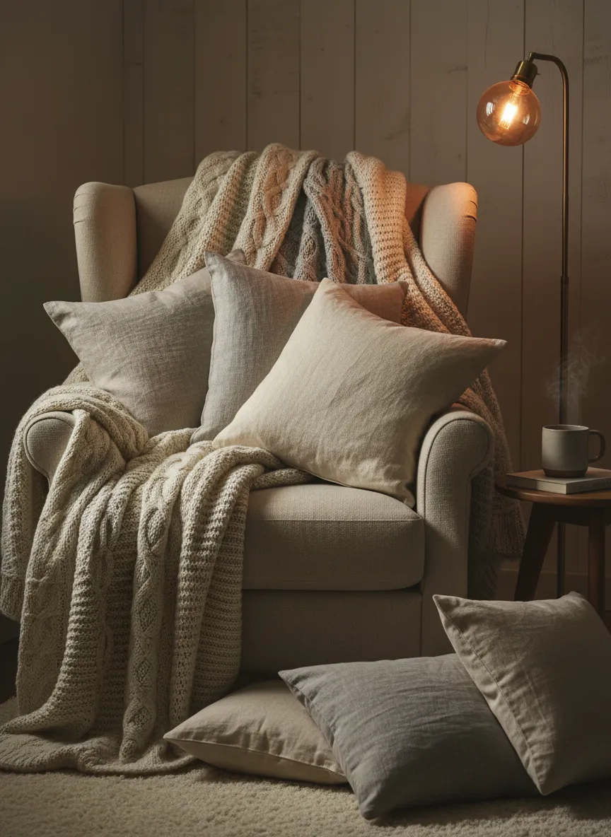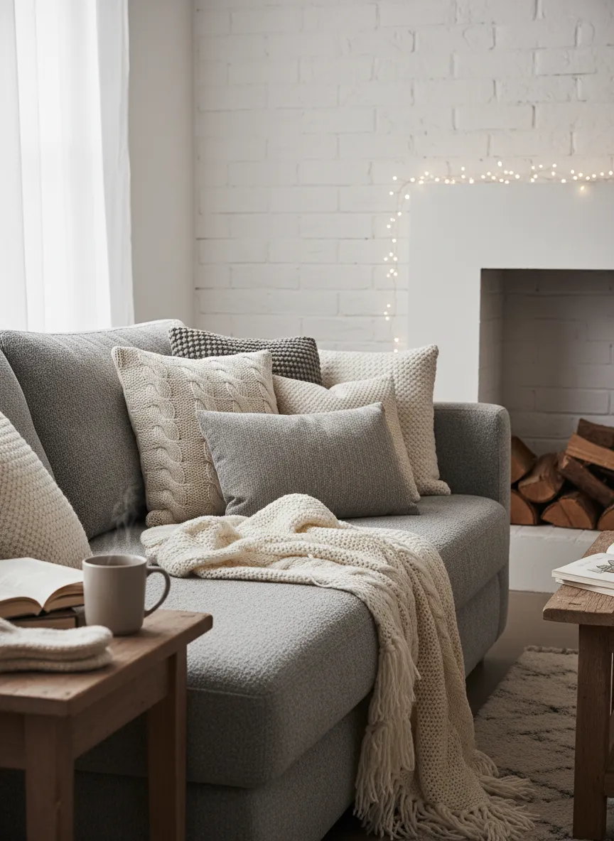 Layered textiles add warmth visually and physically. Thick blankets and soft cushions create comfort. Neutral fabrics keep the look calm. The room feels inviting and snug.