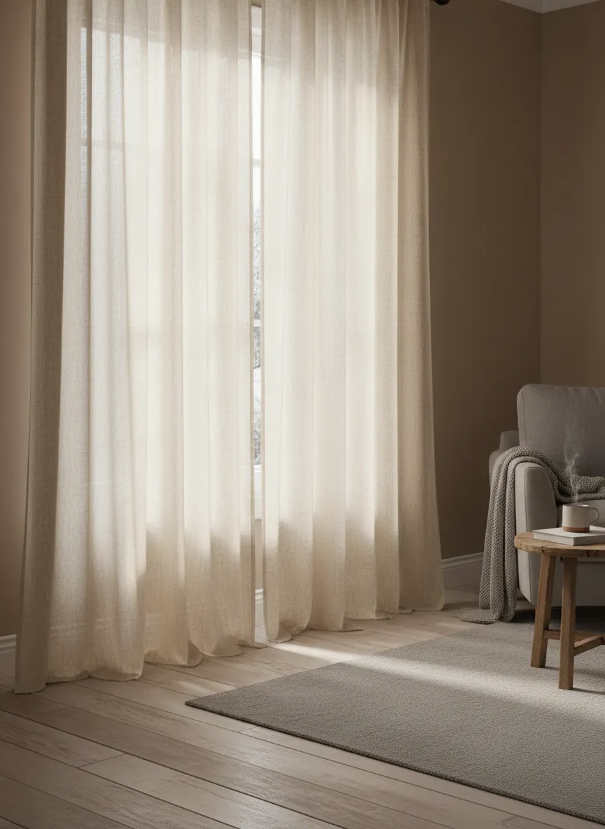 Curtains help keep warmth inside visually. Light fabrics create gentle movement. Neutral tones blend easily with decor. The windows feel inviting.