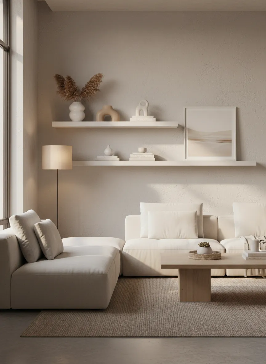 The living room gains quiet character. Texture softens flat surfaces naturally. This warm neutral wall styling option works beautifully in cozy interiors.