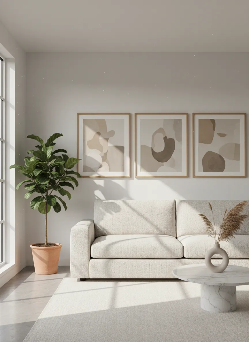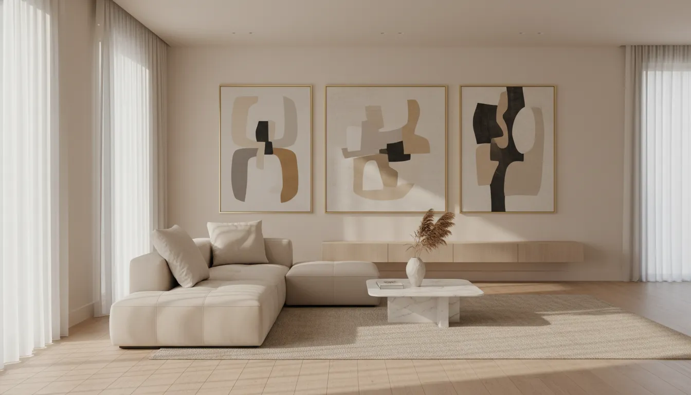 Framed artwork anchors the seating area visually. Soft abstract prints keep the mood relaxed. Thin frames prevent the wall from feeling heavy. The arrangement stays simple and balanced across the sofa.