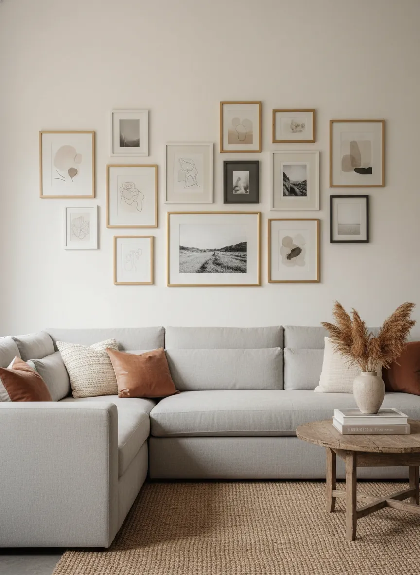 A gallery wall brings personality gently. Similar frame tones keep the display cohesive. Balanced spacing prevents visual clutter. The wall feels lively yet calm.