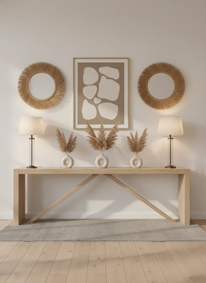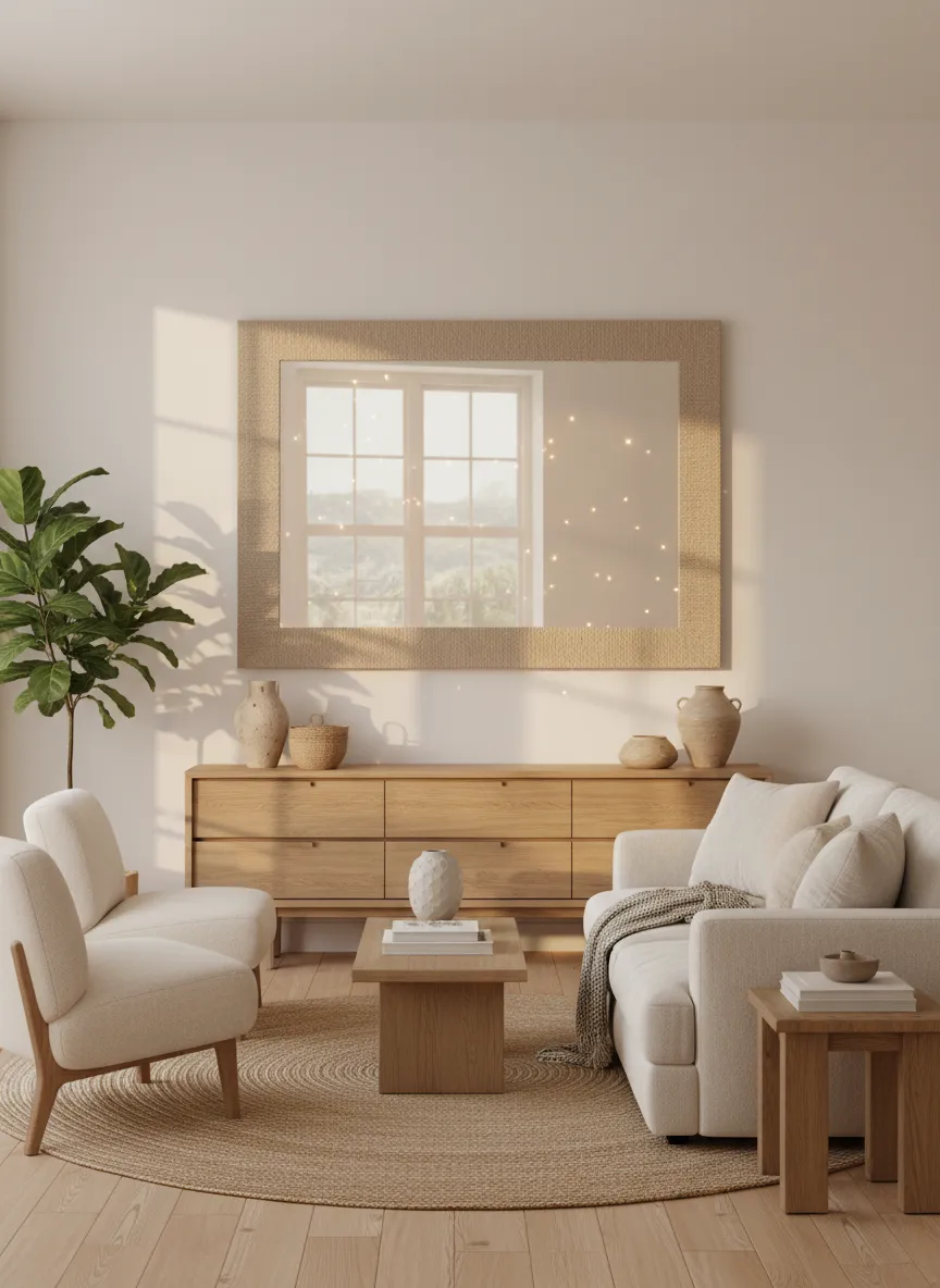 A large mirror expands the sense of space instantly. Light reflects softly across the room. Simple frames keep the look minimal and elegant. The mirror becomes a gentle focal point.