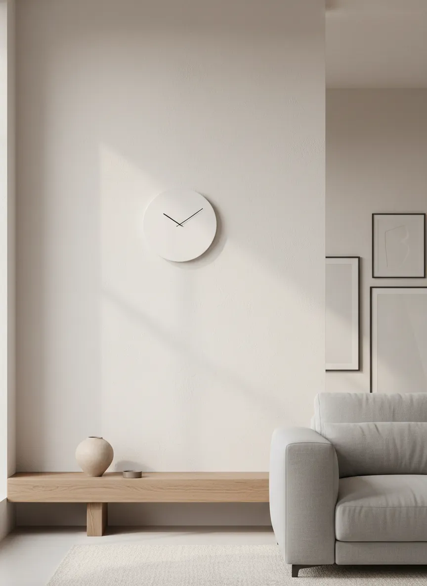 A simple clock adds function without distraction. Neutral tones keep the look clean. Slim shapes prevent visual heaviness. The wall remains calm and practical.