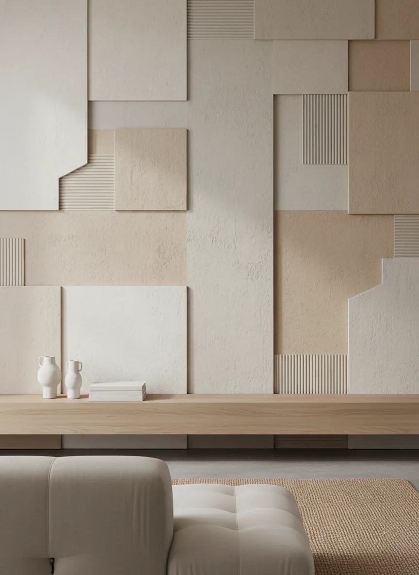 Textured panels add depth without bold color. Soft patterns create subtle visual interest. Neutral shades keep the design calm and cohesive. The wall feels layered yet simple.