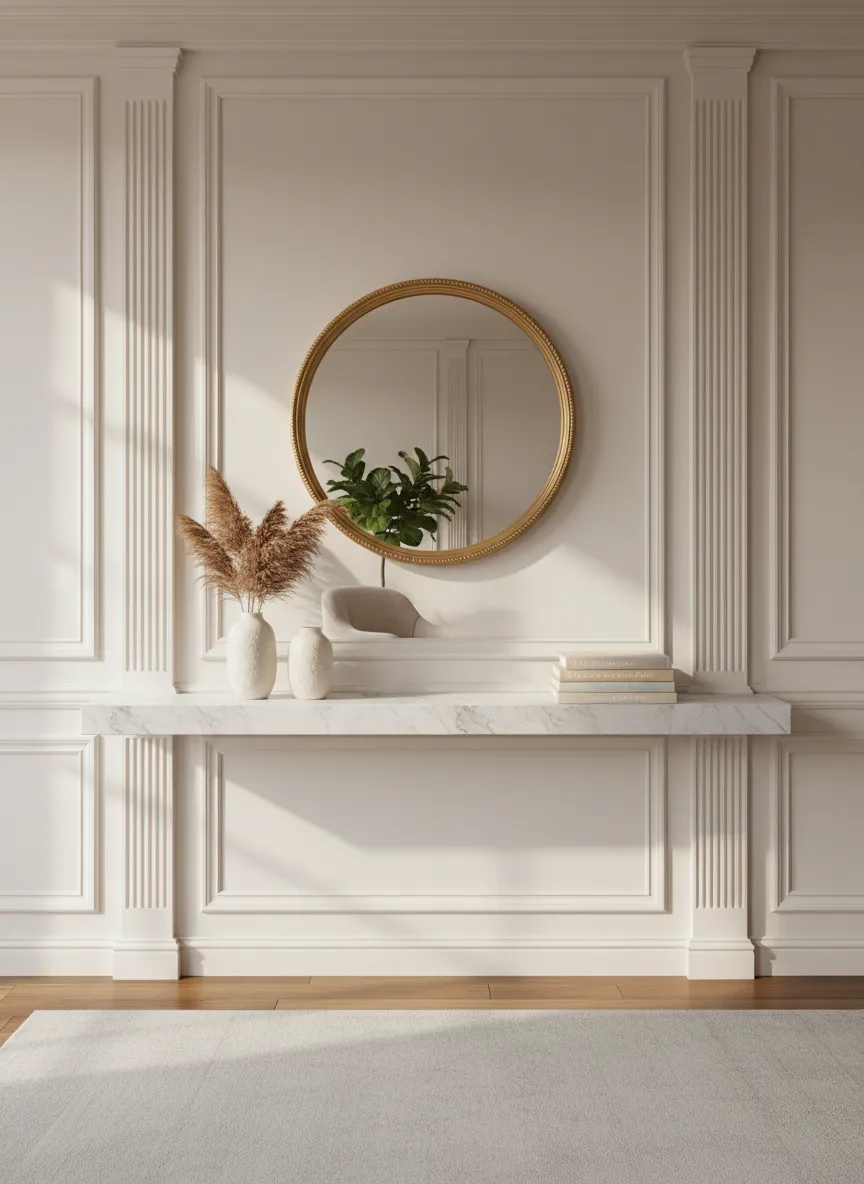 Molding adds architectural depth quietly. Painted trim blends with the wall color. The detail feels subtle and refined. Surfaces remain clean and elegant.