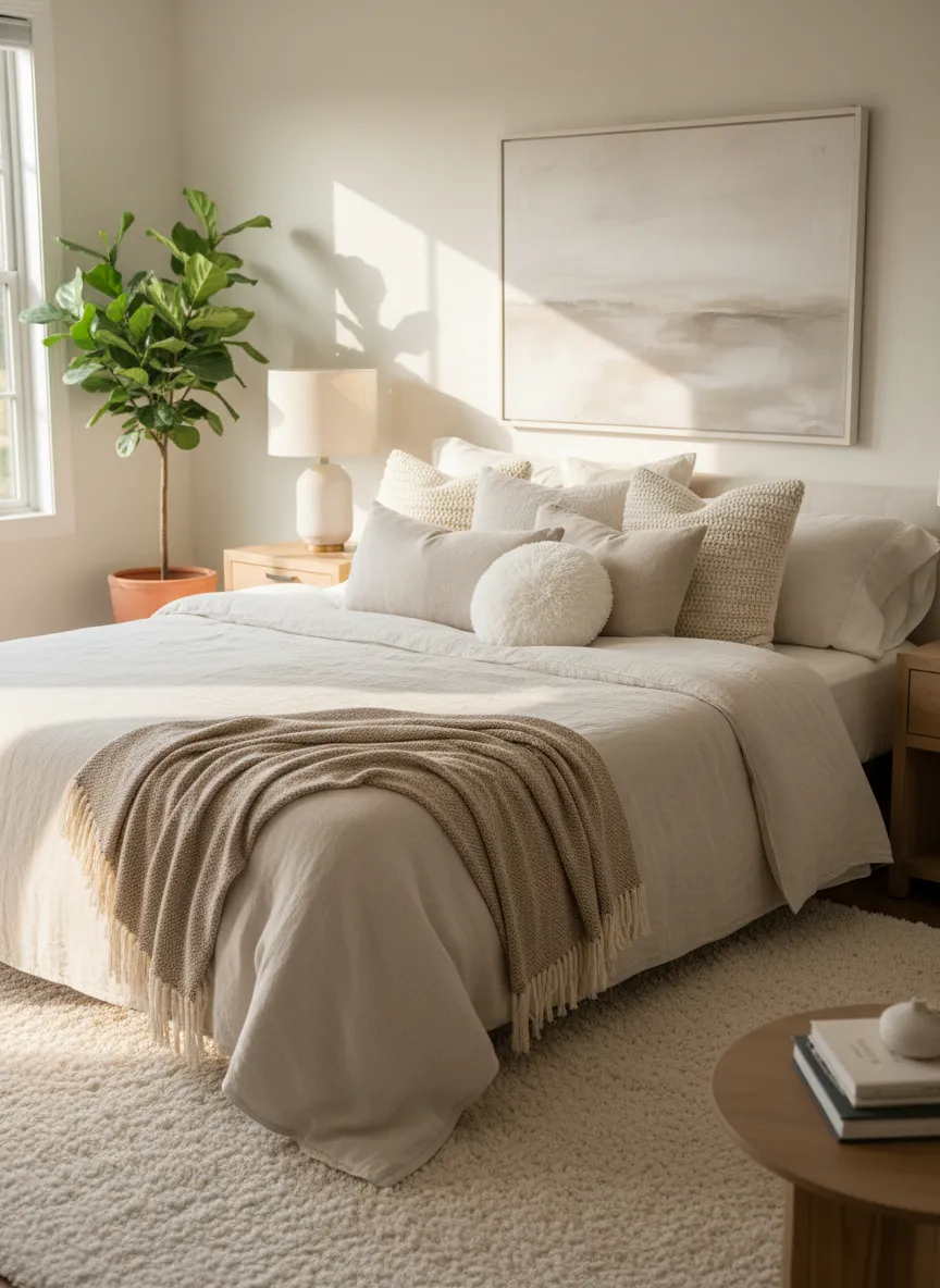 Throw pillows change the mood of a bed easily. Simple cotton or linen covers stay inexpensive. Neutral colors blend with any bedding. Small accents add warmth without boldness.