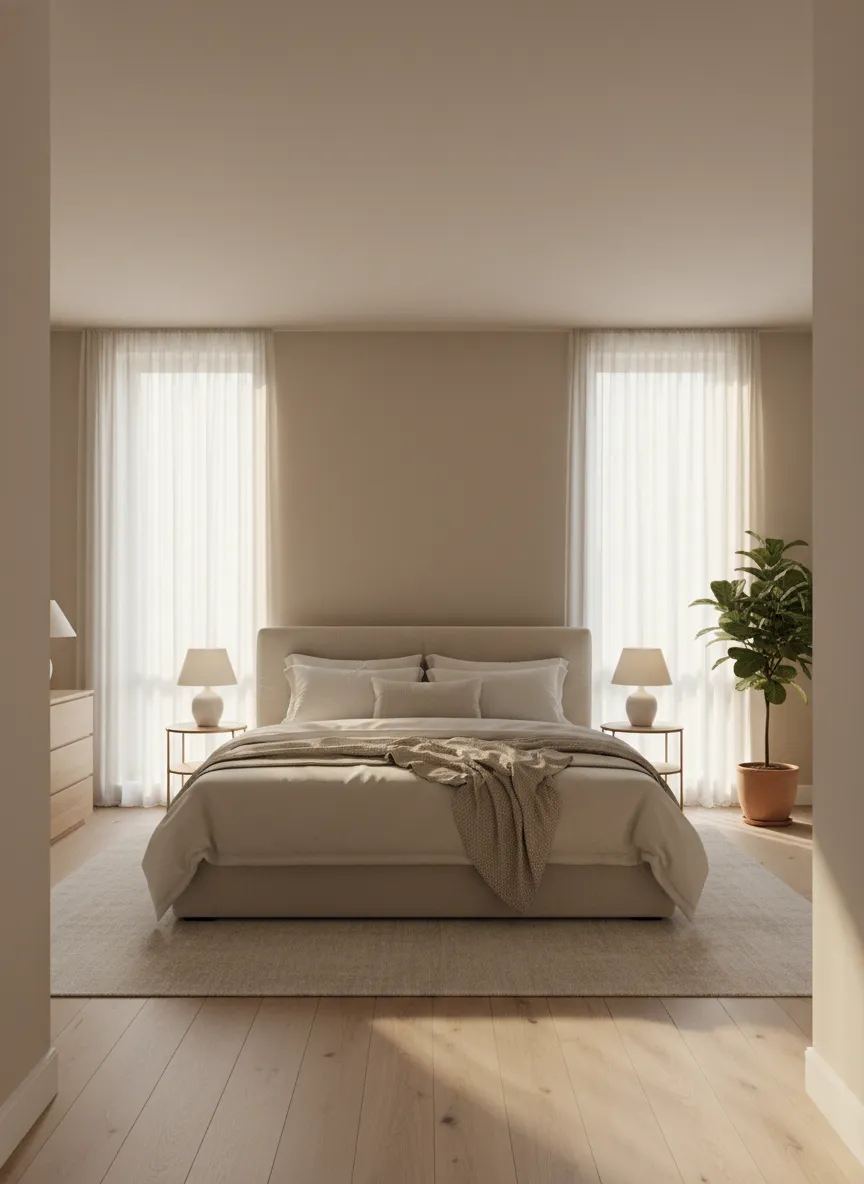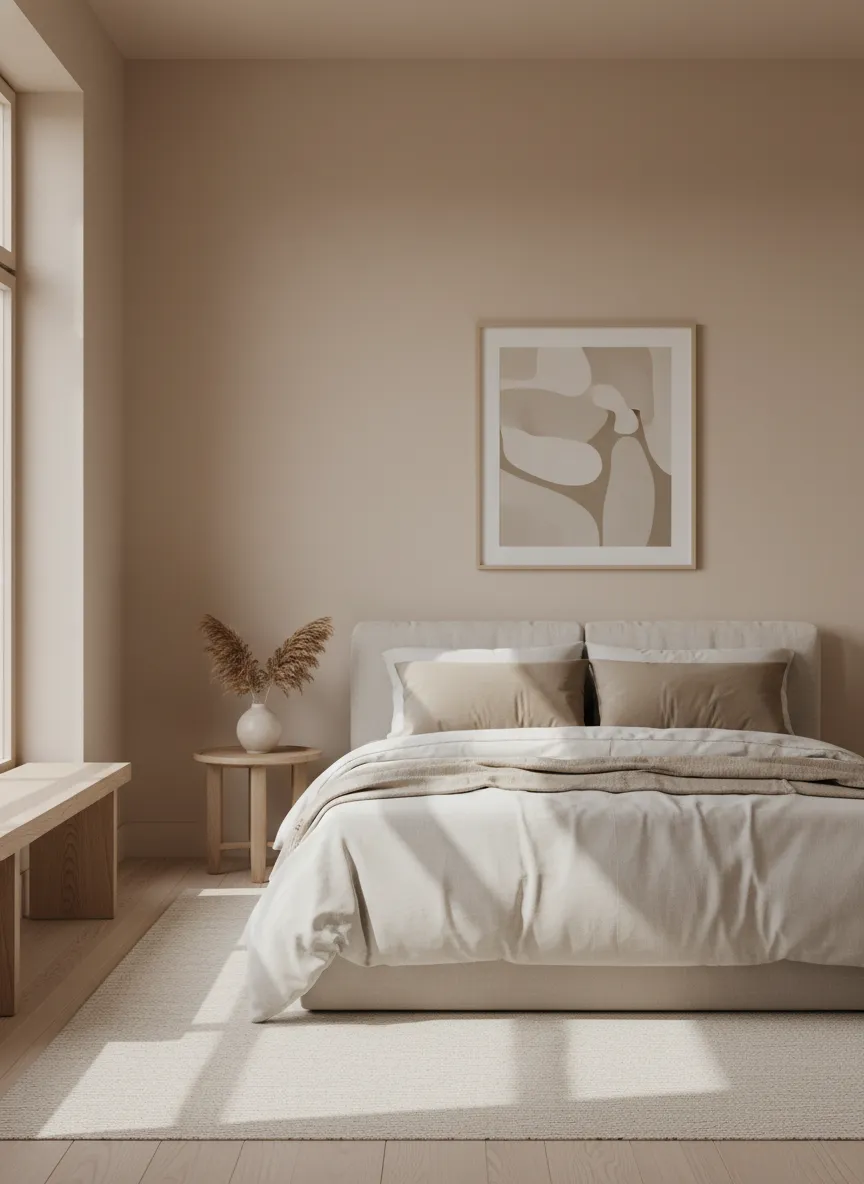 Soft neutral walls form the base of minimal bedrooms. Beige and warm white reduce contrast. Surfaces appear smooth and quiet. Light reflects gently without glare.