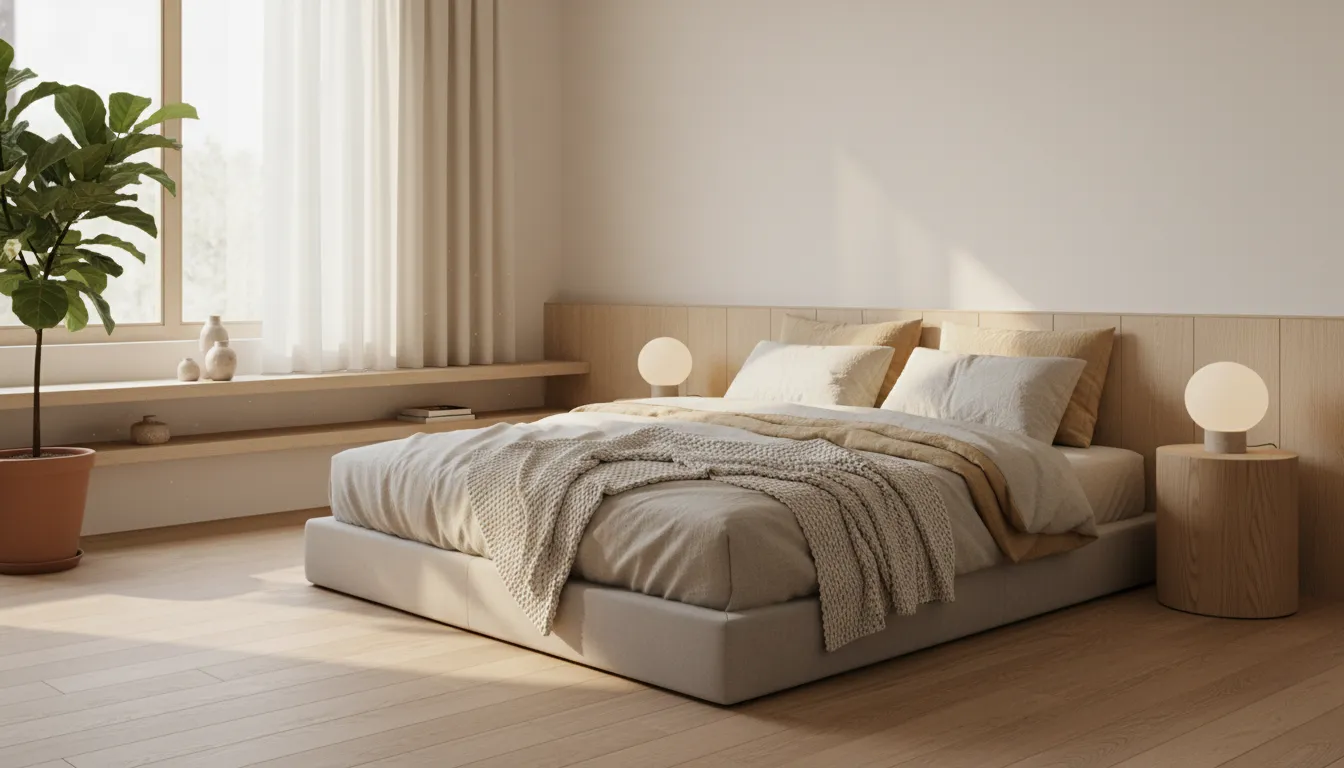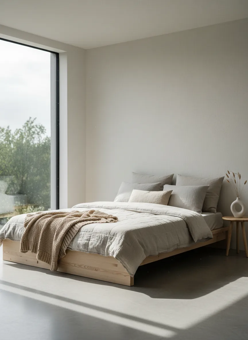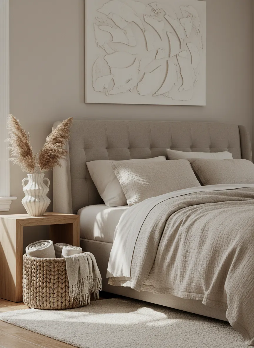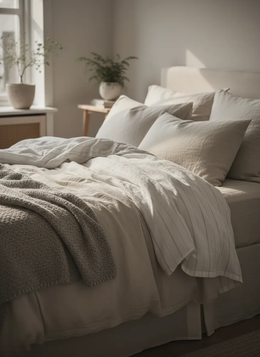 Neutral bedding builds softness through fabric. Linen feels airy. Cotton adds gentle volume. Throws create movement.