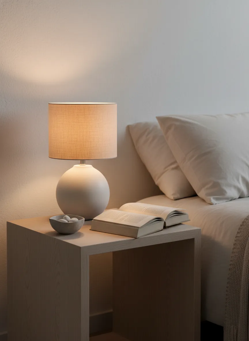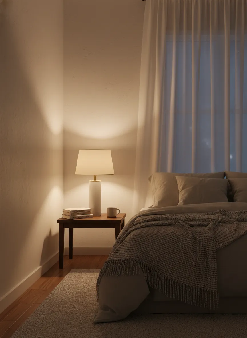 Warm lighting softens minimal rooms. Lamps replace harsh overhead light. Shadows stay gentle.