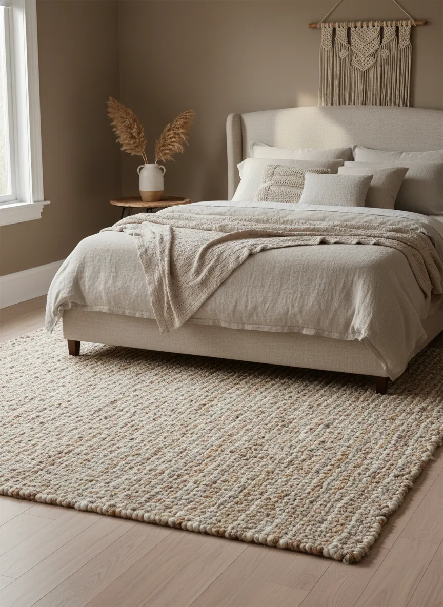 The bedroom feels grounded and cozy. Flooring becomes more comfortable. Texture adds depth without clutter.