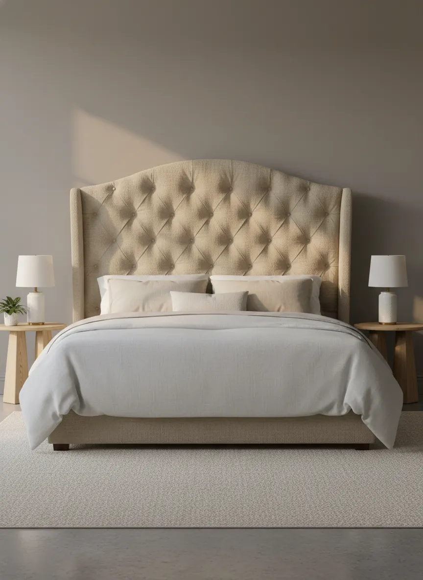 Fabric headboards soften bedroom structure. Upholstery absorbs light gently. Neutral tones blend easily.