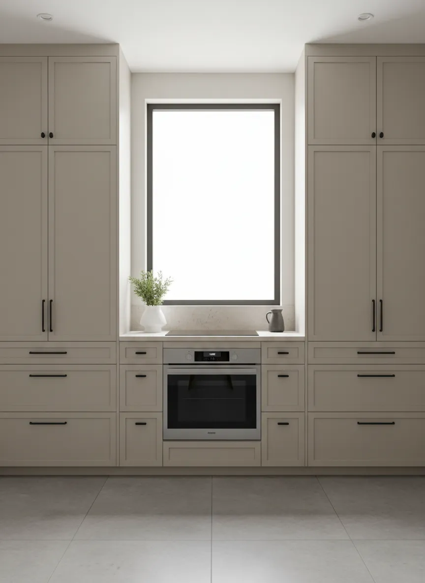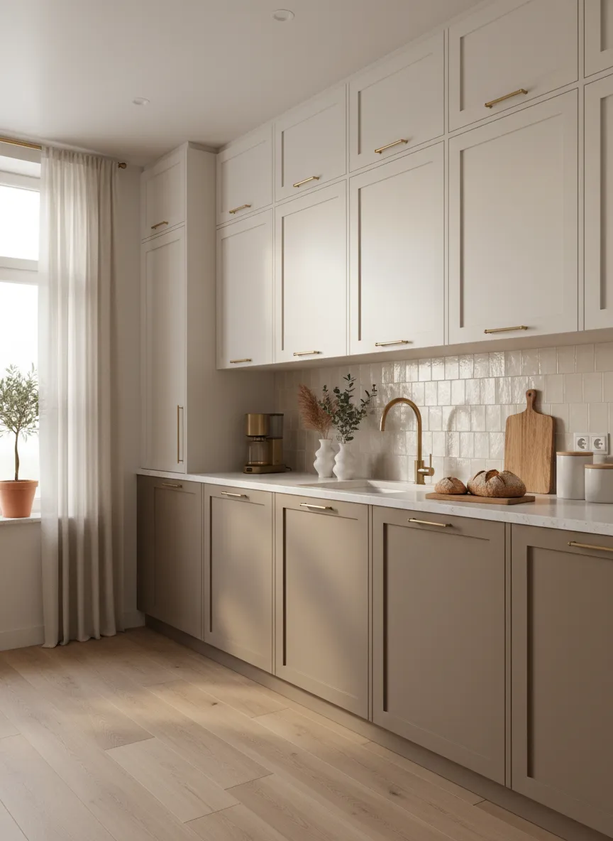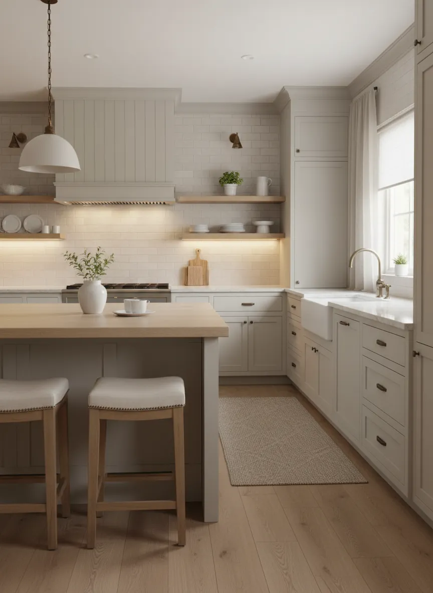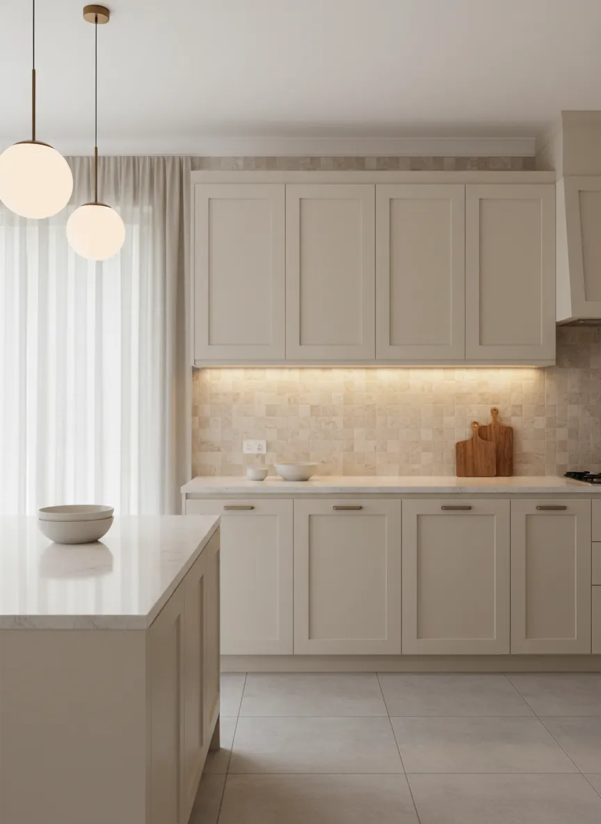 The kitchen feels layered and cohesive. Subtle variation keeps the palette gentle. This choice supports a neutral kitchen color palette with depth.