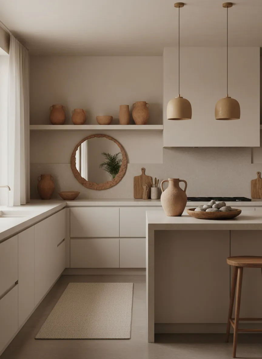 Clay and terracotta accents bring warmth. The earthy color feels natural and soft. Small pieces prevent the room from looking flat. The palette remains neutral and grounded.