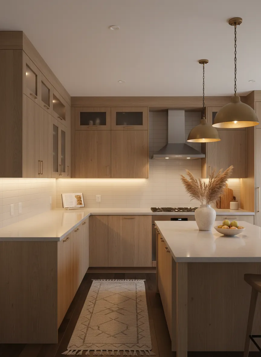 Warm lighting deepens neutral colors slightly. Soft bulbs prevent harsh brightness. Under-cabinet lights add subtle glow. The palette feels richer at night.