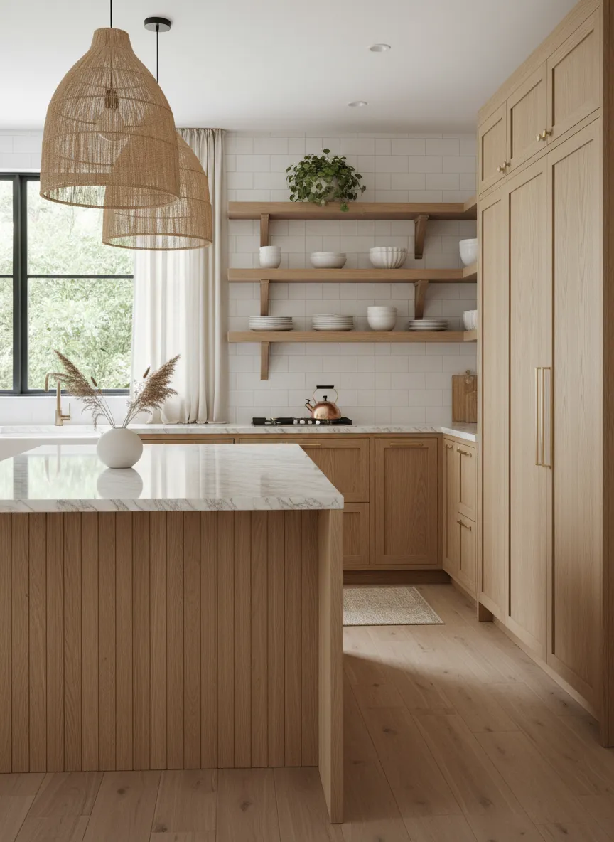 Natural wood adds warmth to neutral kitchens. Oak and ash tones feel soft and organic. The texture contrasts gently with painted surfaces. Wood prevents the palette from looking plain.