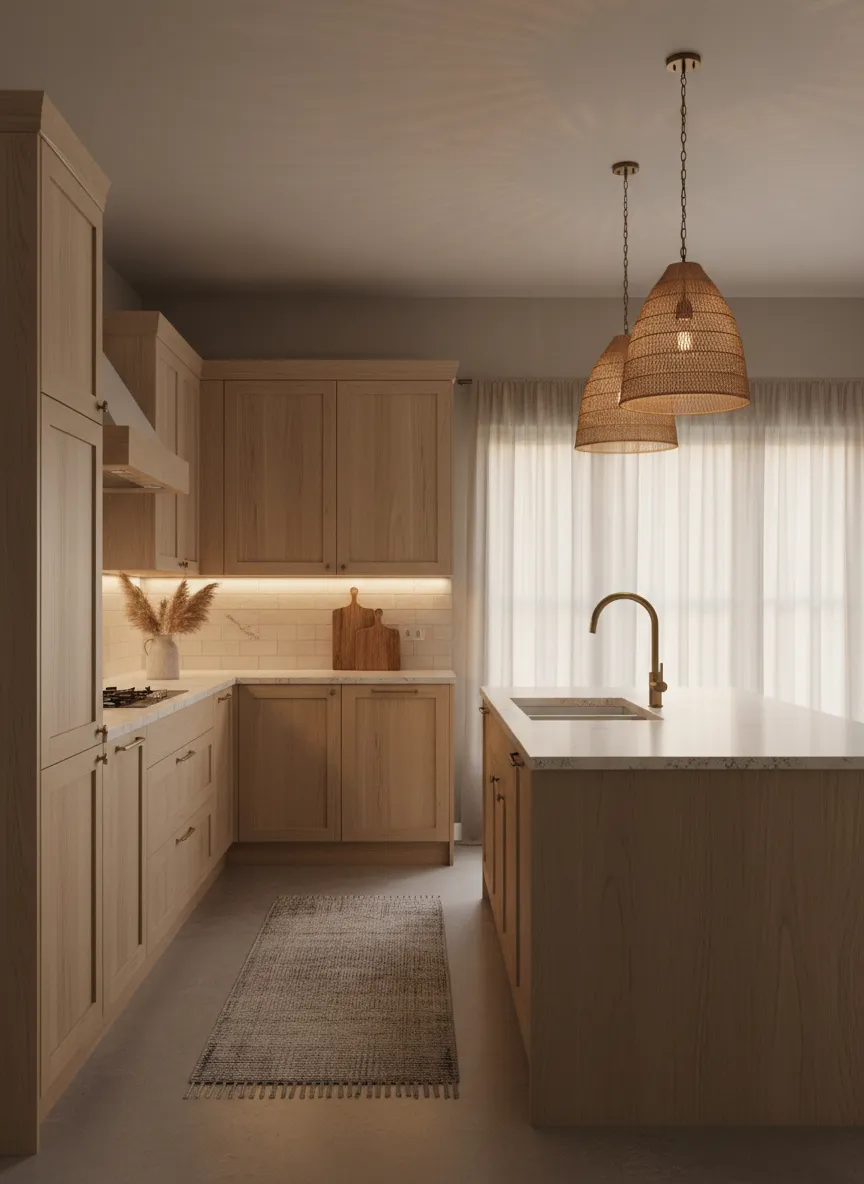 The kitchen feels cozy and welcoming after sunset. Light shapes the mood without new decor. This final detail completes a calm and balanced design.