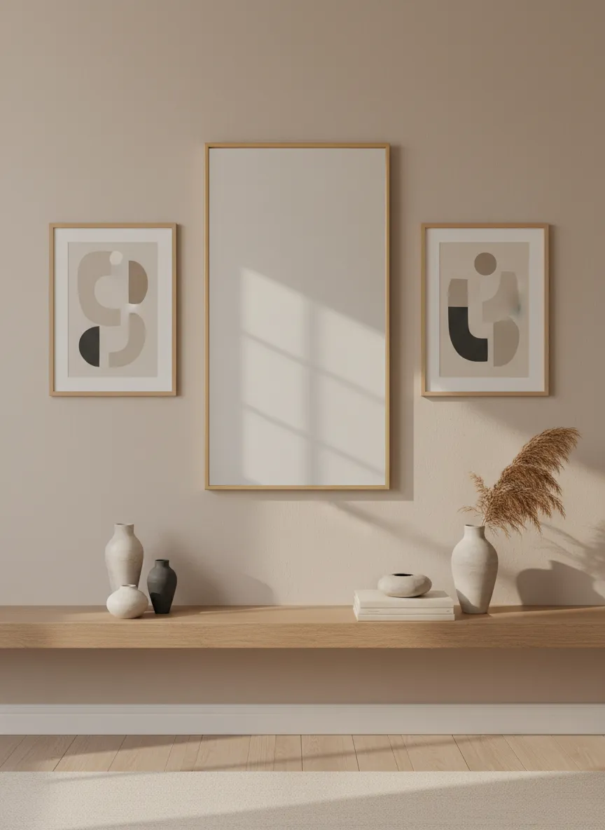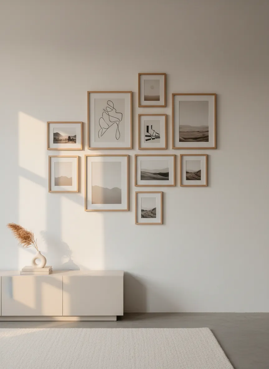 Framed artwork creates structure on large wall areas. Soft abstract prints keep the look gentle. Light wood or thin metal frames feel clean and modern. The arrangement stays simple and balanced.
