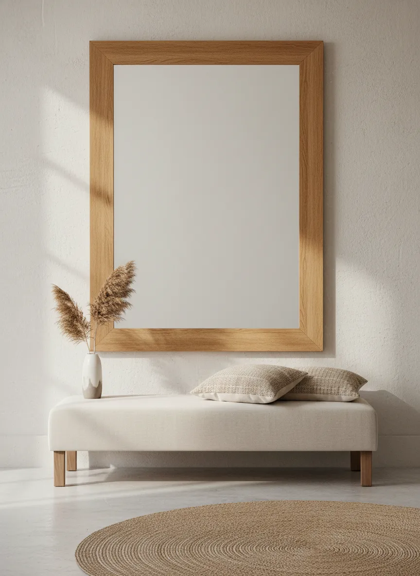 Mirrors reflect light and expand visual space. Large shapes create a calm focal point. Simple frames blend easily with neutral interiors. The wall feels brighter instantly.