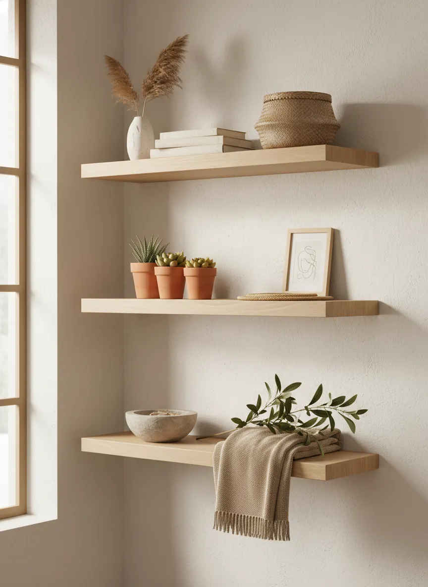 Floating shelves combine decor and function. Small objects and books sit neatly on the surface. Light wood tones keep the look airy. The arrangement remains uncluttered.