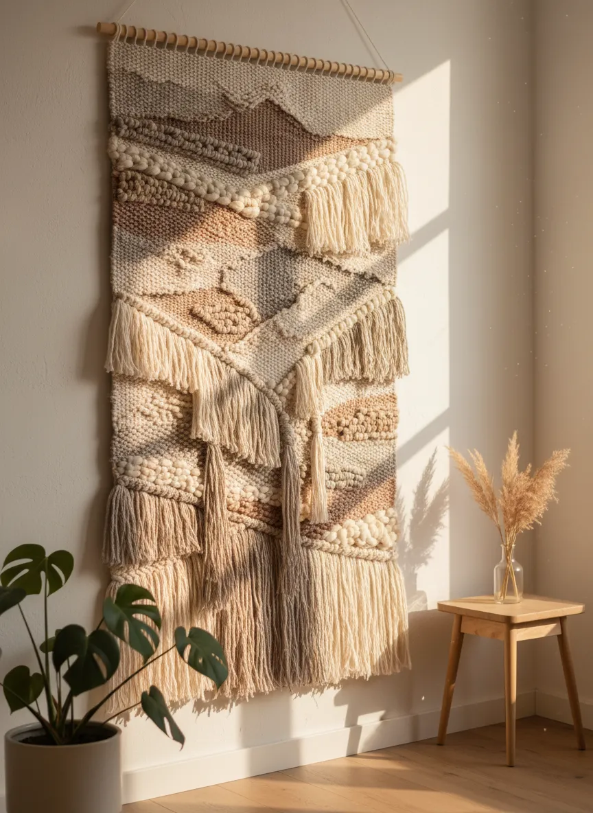 Textured wall hangings add softness to flat surfaces. Woven fabric introduces natural detail. Neutral colors keep the look light and calming. The piece feels warm and inviting.